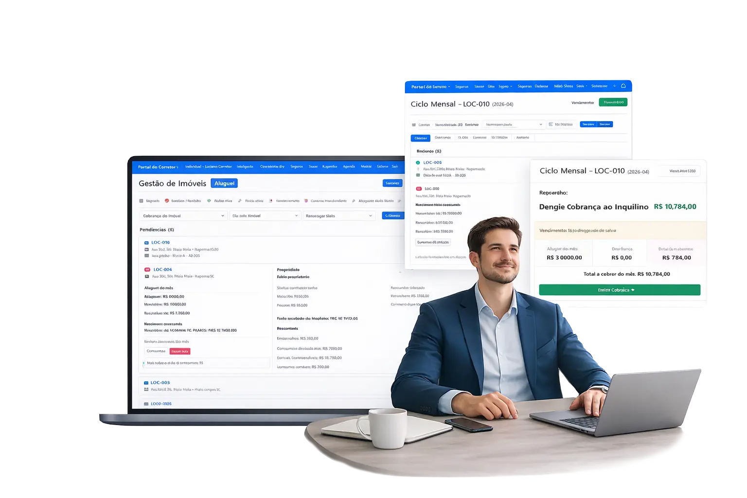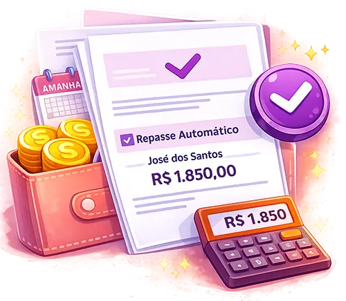 Contratos, cobranças, repasses e histórico em um único painel.